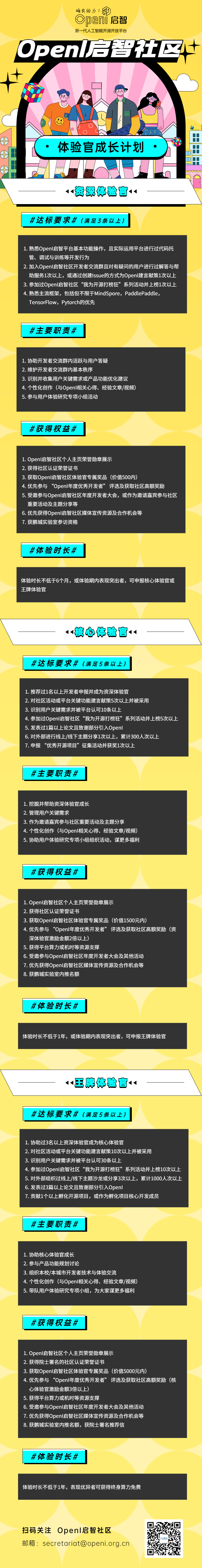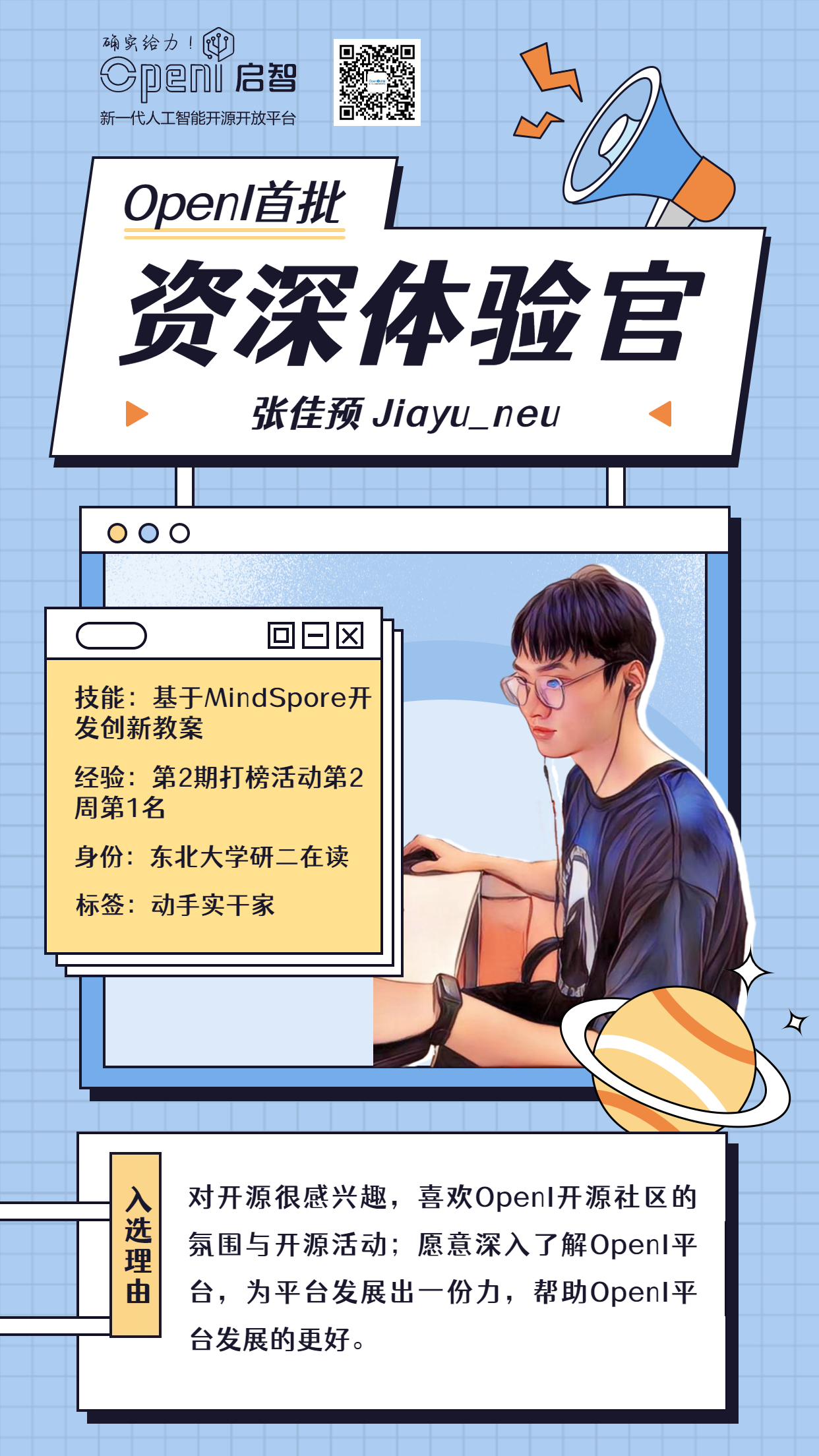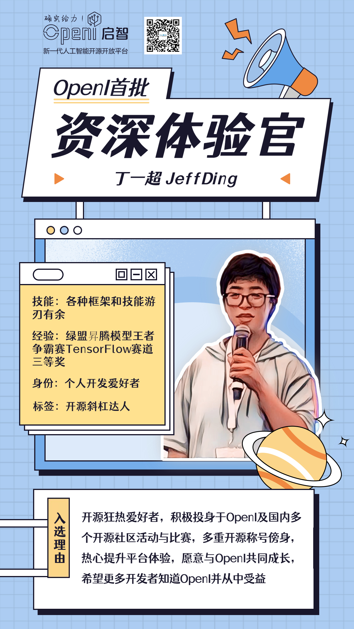 所以~~为了给AI开源领域挖掘更多优秀开源开发者,让大家有一个更好的平台能一展才华,同时帮助OpenI 更好地构建开源生态、提升平台体验、维护社群活跃氛围,OpenI 初次招募5名有活力有经验有技术且乐于助人的开发者们作为资深体验官,共同携手,创造美好开源未来。