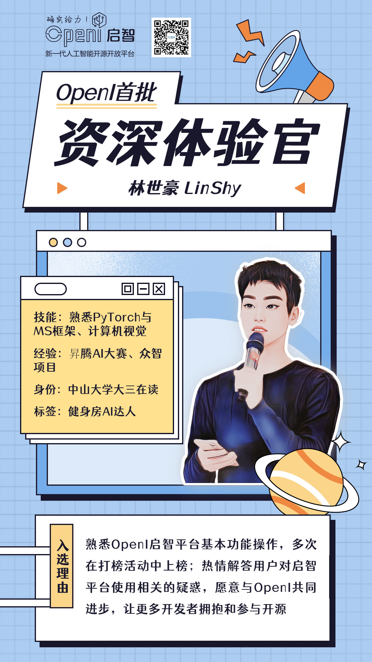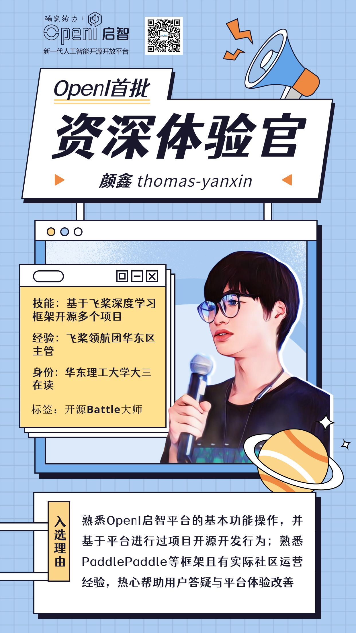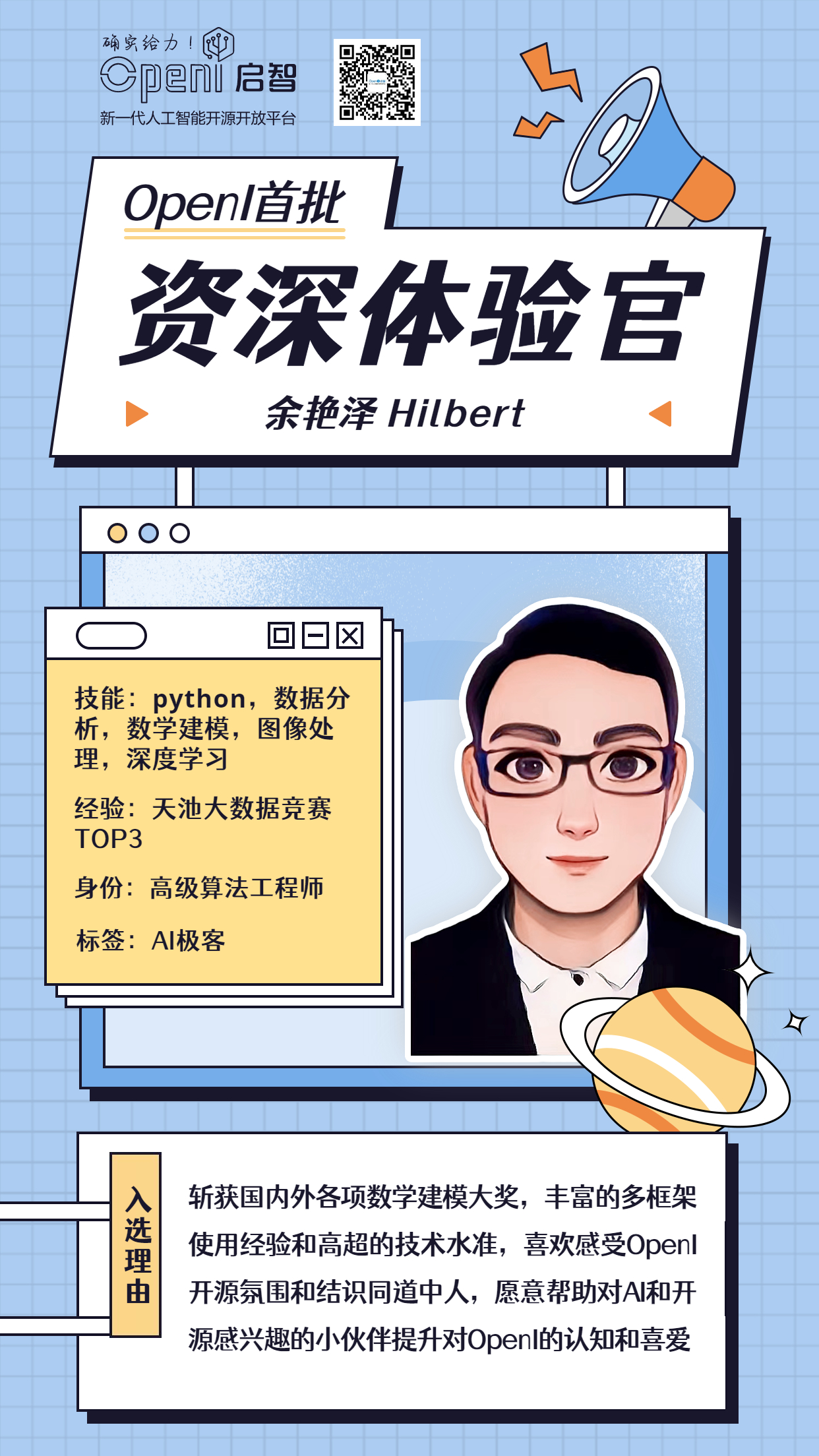 所以~~为了给AI开源领域挖掘更多优秀开源开发者,让大家有一个更好的平台能一展才华,同时帮助OpenI 更好地构建开源生态、提升平台体验、维护社群活跃氛围,OpenI 初次招募5名有活力有经验有技术且乐于助人的开发者们作为资深体验官,共同携手,创造美好开源未来。