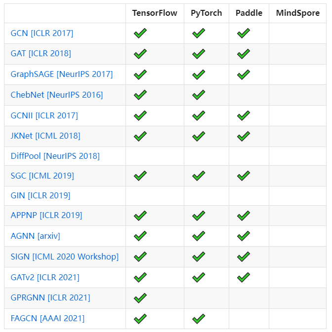 除此之外,GammaGL遵循了PyTorch Geometric (PyG) 的Tensor-centric设计原则与接口设计,即将PyG扩展为TensorFlow Geometric、Paddle Geometric、MindSpore Geometric。同时,G还提供了二十几个主流经典的模型,供大家一键切换后端使用。