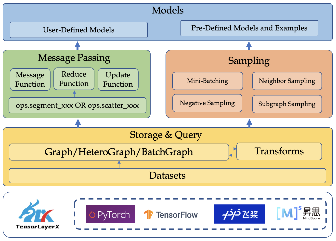 • 底层基于深度学习框架来支持,提供了自动微分的计算算子、数据管理与处理流程、训练流程等,并由TensorLayerX使用统一接口进行封装。