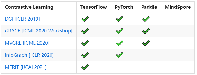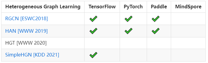 除此之外,GammaGL还提供了二十余个算法供大家使用,包含同质图上一些经典的模型、对比学习模型、异质图神经网络模型等。