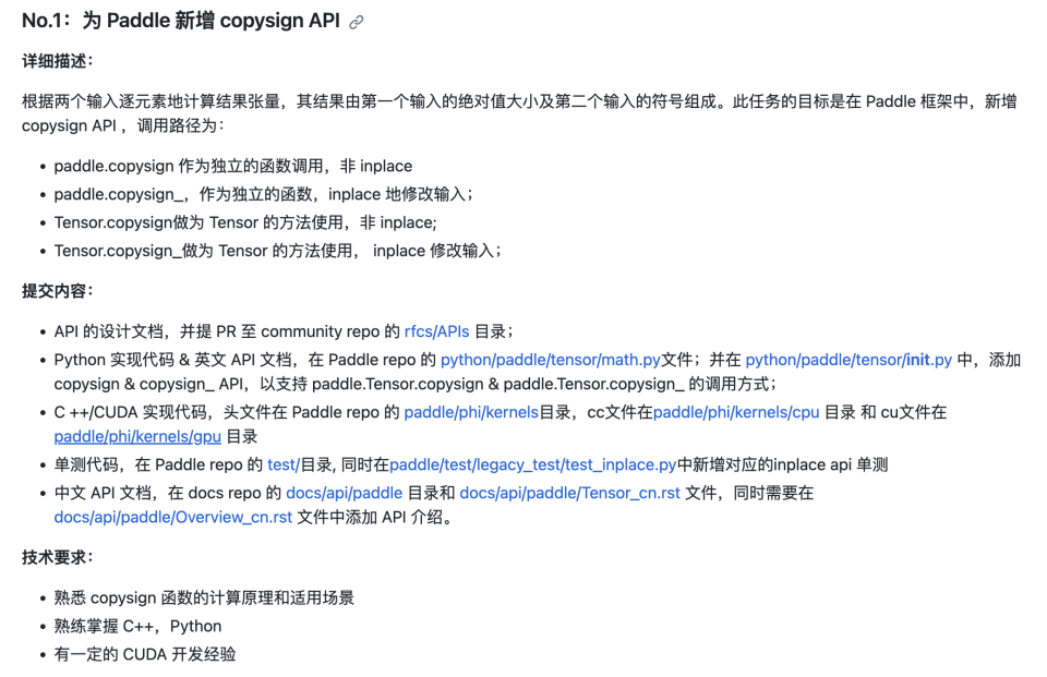 以开源贡献为核心,基于GitHub的飞桨及生态伙伴开源项目代码贡献。开源项目包括:飞桨核心框架、飞桨科学计算、飞桨CV套件、飞桨大模型套件、推理部署套件、生态伙伴项目等。开发者使用GitHub ID报名,独立完成具有明确验收目标的贡献任务,获得对应的任务奖励。奖金2000-6000元。本期完成的框架开发任务能够进入飞桨框架 v2.6 发版流程,贡献者成果被全体飞桨框架用户共享。