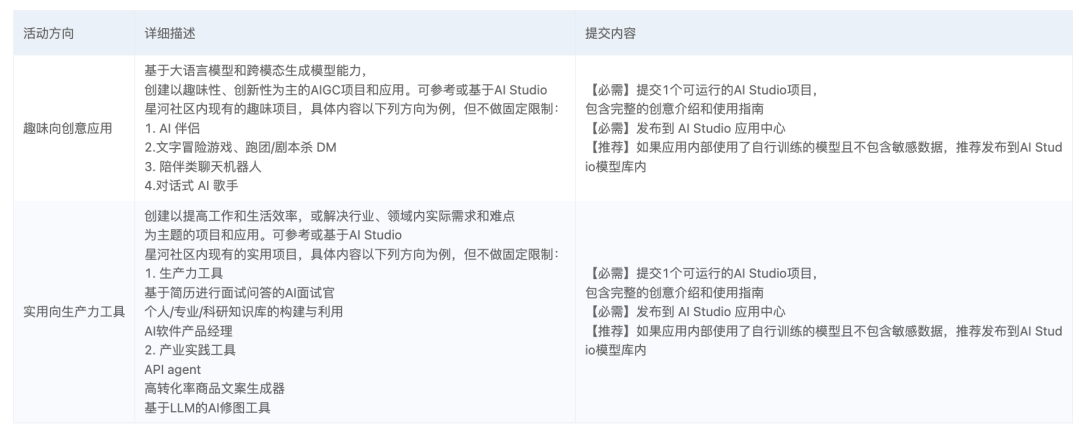 基于飞桨AI Studio星河社区的大模型创意与产业应用项目开发挑战赛,鼓励开发者发挥想象力和创新精神,策划基于文心大模型的创意方案与创新应用,开发者独立或组队在飞桨AI Studio星河社区内提交大模型应用创意项目,最终结合应用人气和专家评审,综合进行奖项评选。
