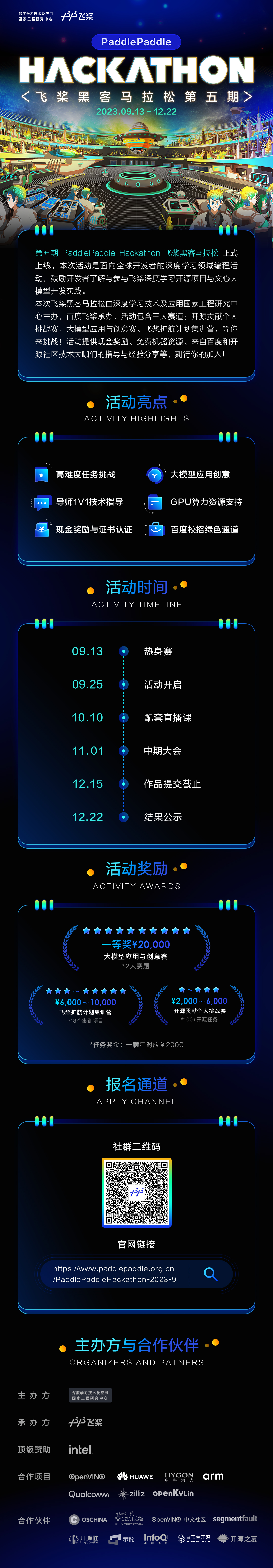 2023PaddlePaddle Hackathon飞桨黑客马拉松第五期正式上线,本次活动是面向全球开发者的深度学习领域编程活动,鼓励开发者了解与参与飞桨深度学习开源项目与文心大模型开发实践。