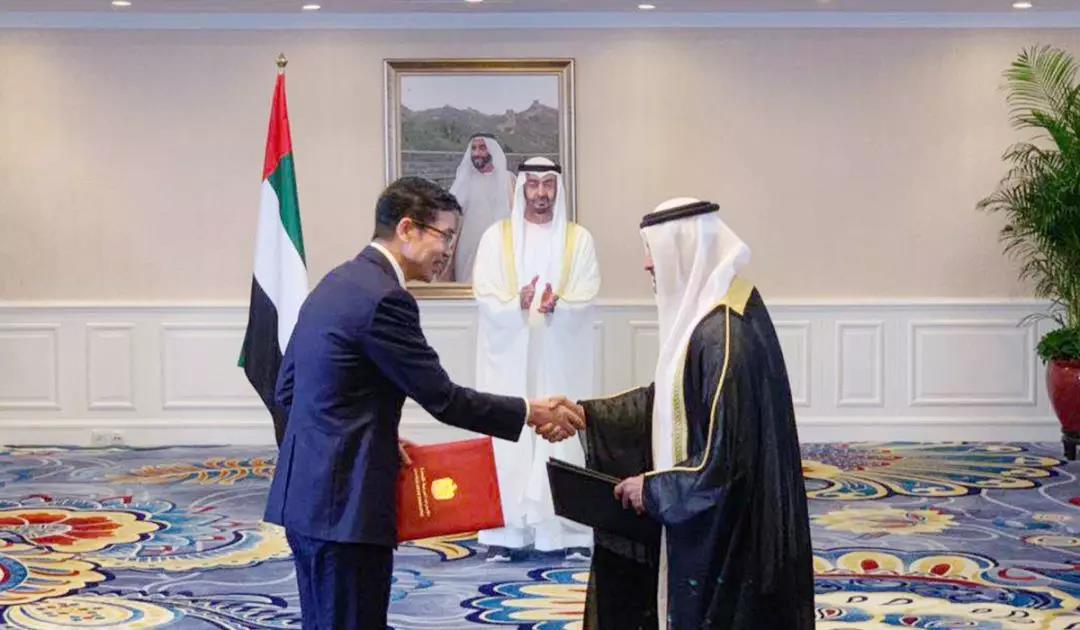 7月23日,北京,在庆祝中国与阿拉伯联合酋长国建交35周年招待会上,正在中国进行国事访问的阿联酋阿布扎比王储穆罕默德,亲自见证商汤科技与阿布扎比投资办公室达成战略合作。