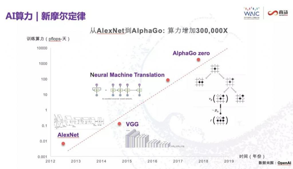 如果我们从一个更长的时间尺度来看,我们会看到,这一系列成功故事的背后还蕴含着另外一层重要的趋势,就是它们所需要的计算能力的指数式的增长。从 AlexNet 到 AlphaGo Zero,在短短的五六年时间里面,对算力需求增长了超过三十万倍,可以说这几年深度学习的成功,人工智能的爆发,在一定程度上就是把算力连接到有价值的产业应用所促成的结果。