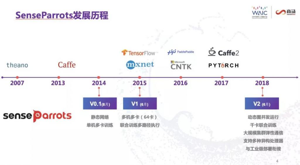 从那时候开始,Parrots 跟商汤共同成长,经历了五年的发展。2015 年的时候,几乎与 TensorFlow 同时,我们发布了第一版的 SenseParrots。那时候它已经具备了多机多卡联合训练和多路径执行的领先业界的特性。之后又经过了三年的发展,我们于去年内部发布了 SenseParrots 的第二代。在这一代它不但具有了一系列更加重要的特性,具备了更丰富的能力和更高的性能,而且也逐渐成为了商汤赋能 AI 产业的战略支撑。