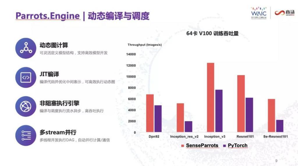 而 SenseParrots 在这一点上面,有所不同,它走的是动态实时编译的道路。所有的代码,都是在运行过程当中即时编译,并且放到引擎上大规模地并行执行。这就让它具备了像传统的静态深度网络的伸缩性,同时也具备了当代的动态编程模型的灵活性。达到了这两者最佳的组合。