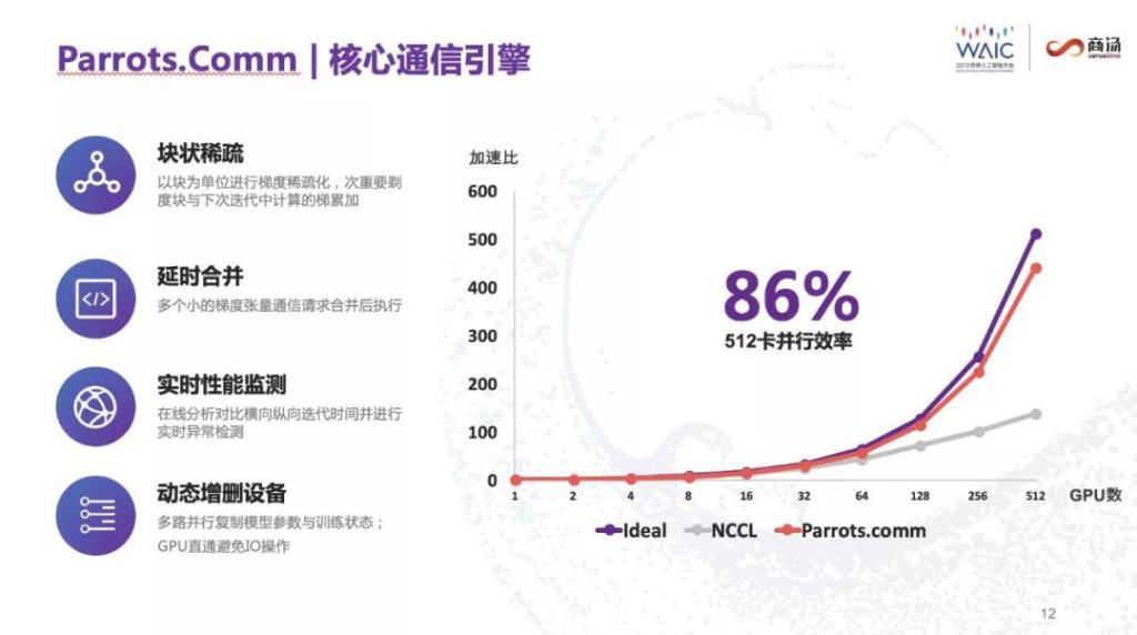 在商汤内部的训练框架里面,我们并不依赖外部提供的通信库。我们有自己的核心通信引擎,里面实现了一系列的领先的先进的性能,包括通过块状稀疏;还有通信的延时合并,能大大地节省通信量,提高了在大规模并行情况下的通信效率。