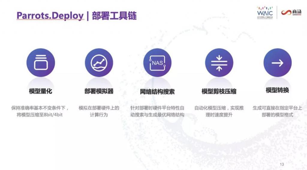 所以 SenseParrots 还提供了一系列的工具,包括模型量化工具;部署模拟器,它能够在训练过程中模拟模型在各种设备上性能;还提供了专用的网络结构搜索的工具,在特定计算约束条件搜索下一个最高性能的模型;还提供了包括模型剪枝压缩、模型转换等工具,让训练出来的模型能够无缝的衔接到我们生产部署的环境中。