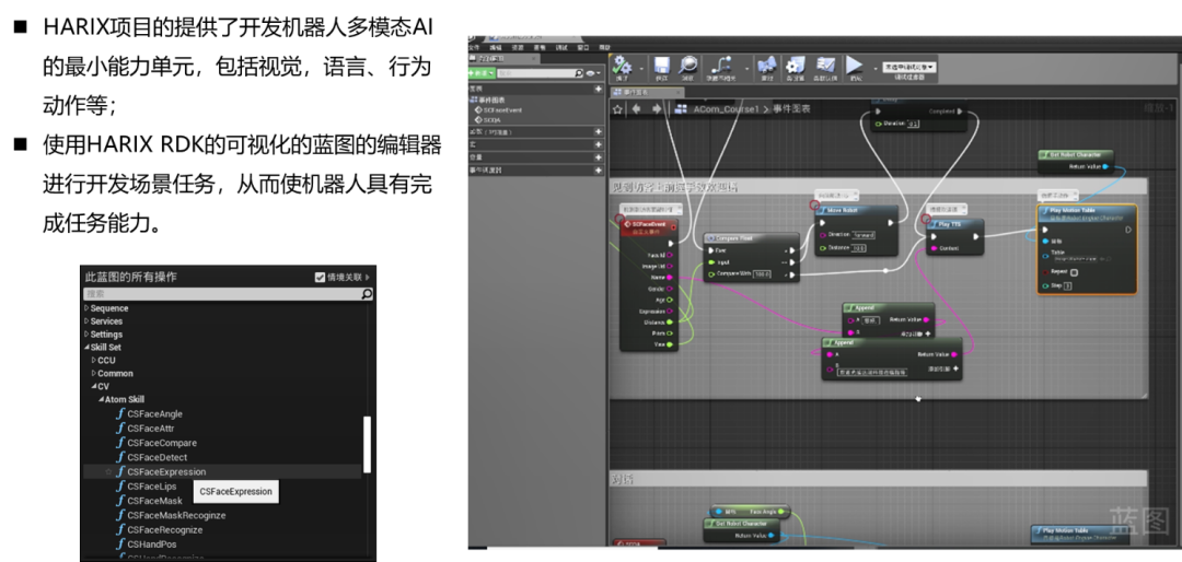 Harix机器人模型库开源项目中包括的RDK(Robot Development Kit)是机器人开发套件,可以支持开发者通过云端服务开发与训练快速开发机器人技能和应用。其中技能包括智能语音、机器视觉、智能行动、多模态交互操作等一系列智能机器人相关能力,开发者可根据实际场景需求进行技能开发、调试以及组合,通过使用模块化技能集提供的底层封装能力,可在Harix项目的蓝图编辑器模块中通过拖拽蓝图的方式快速便捷的进行应用开发工作。