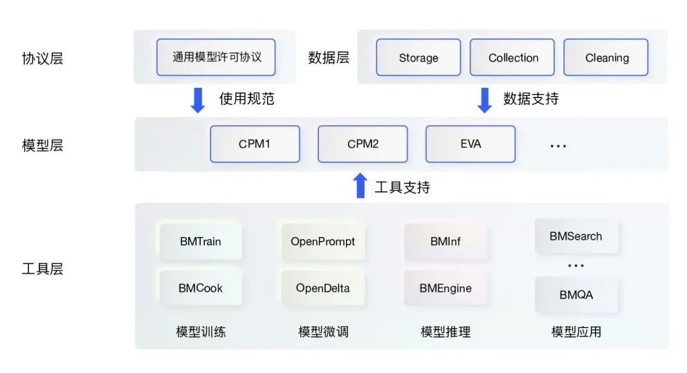 谋定而动,OpenBMB将从数据、工具、模型、协议四个层面构建应用便捷、能力全面、使用规范的大规模预训练模型库。