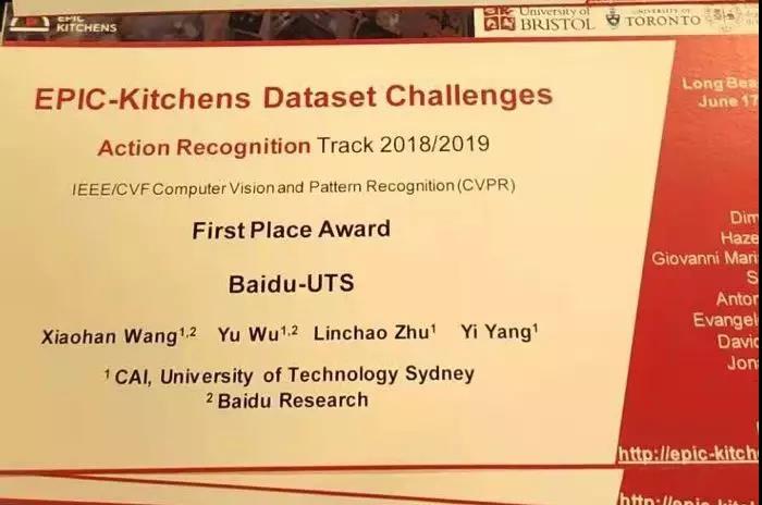 竞赛吸引了 Facebook AI 、牛津大学、 INRIA (法国国家信息与自动化研究所)等66支队伍参与,百度在该任务中的 Seenkitchens 和 Unseen kitchens 两项测试集上以很大优势获得第一,并受邀在 CVPR 2019 EPIC 和 ActivityNet Workshop 上作出报告。