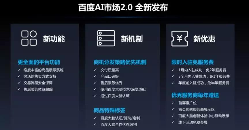 目前百度 AI 市场已经可以实现智能撮合服务,促进产业链多角色协同;已全面上线商业平台基础设施,提供坚实的产品交易保障,更建立了产品认证体系、能力认证体系和百度大脑品牌授权体系。