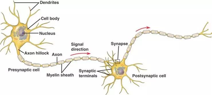 - Axon(轴突):一种树状纤维,将细胞体的输出脉冲传导到神经组织,最终在其他细胞的树突上突触。