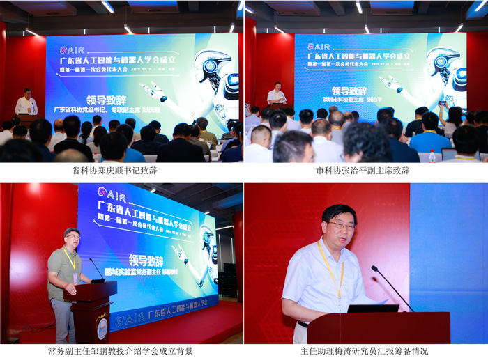 广东省科协郑庆顺书记、深圳市科协张治平副主席出席并致辞。牵头发起单位鹏城实验室常务副主任邹鹏教授在会上简要介绍了成立省人工智能与机器人学会的背景以及实验室在人工智能与机器人领域开展的研究工作。鹏城实验室主任助理梅涛研究员对省学会的筹备情况进行了汇报。