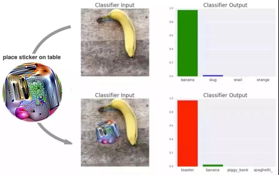 上图中是一根香蕉,然而人工智能却将其识别为烤面包机,即使它使用了在自动驾驶、语音理解和多种 AI 应用中表现出色的强大深度学习技术。这意味着 AI 已经见过了几千张香蕉、蛞蝓、蜗牛和类似外观的物体,然后对新输入的图像预测其中物体的类别。然而这种系统很容易被误导,图像中只是多了一张贴纸,就让系统的预测产生严重偏离。